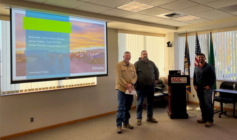 Senior Project Manager Ryan Imel, Superintendent Kenneth Pollard, and Corporate Safety Director Lendel Del Cid. With this win, Slayden is now competing for the national AGC Construction Safety Excellence Awards (CSEA), sponsored by Willis Towers Watson. Winners will be announced in 2023. Congratulations to all our safety, craft, and project management personnel for keeping the Slayden job sites safe.